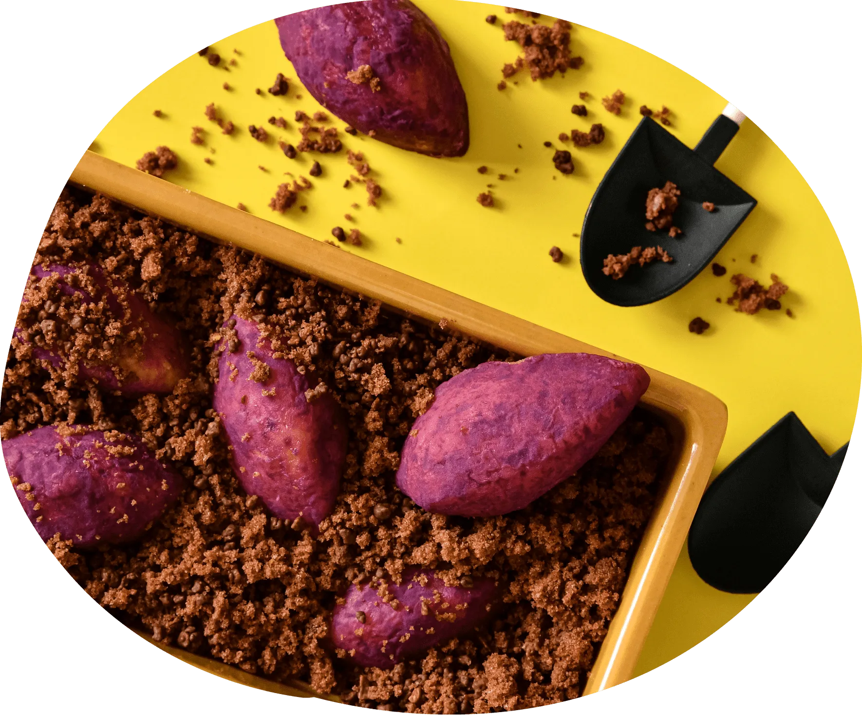 お芋プリンの上部に、土をイメージとしたチョコケーキをちりばめました。掘り進めると中からは、ごろっとしたお芋が出てきます。付属のシャベルでお芋掘り体験を楽しみながらご賞味ください。