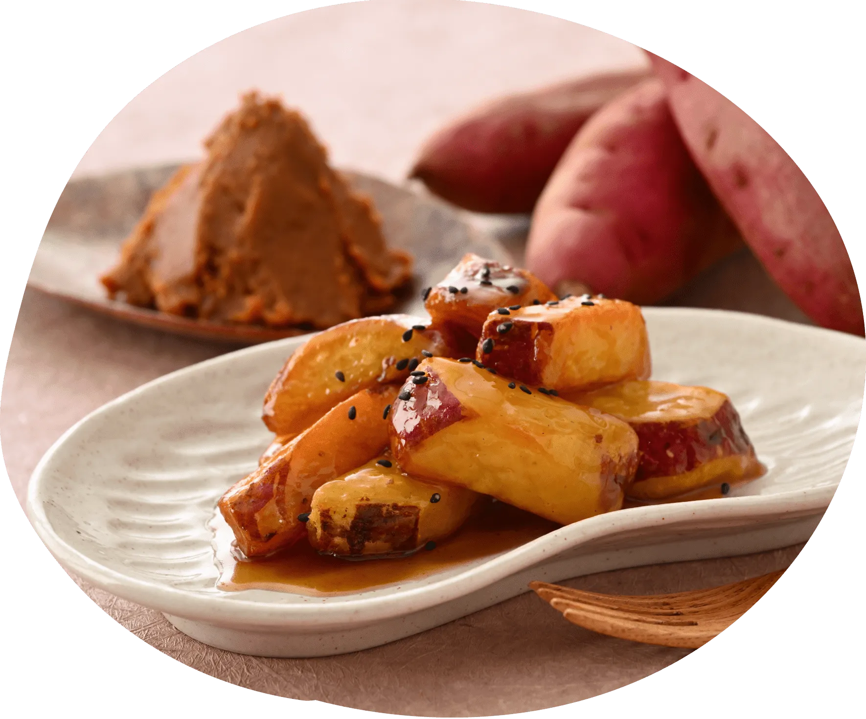 大本山永平寺御用達「米五のみそ」を使用!「スイーツに味噌?!」と思われるかもしれませんが、お芋と味噌の蜜の相性がこれまた抜群です。甘塩っぱくてクセになります。