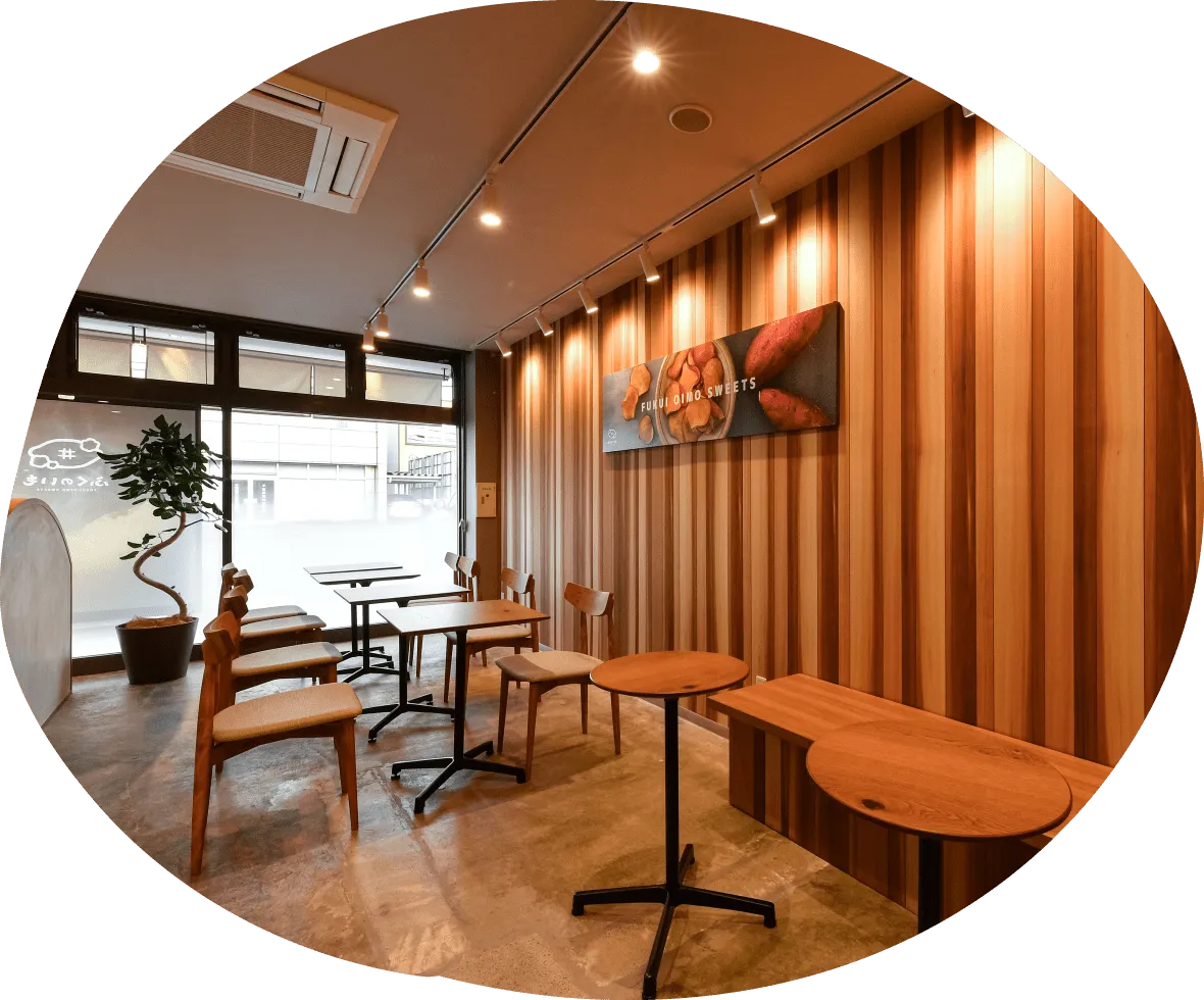 ふくのいもでは、店内のカフェスペースにて、イートイン限定のメニューもご用意しております。上質な空間の中で、最高峰のさつまいもスイーツをお楽しみください