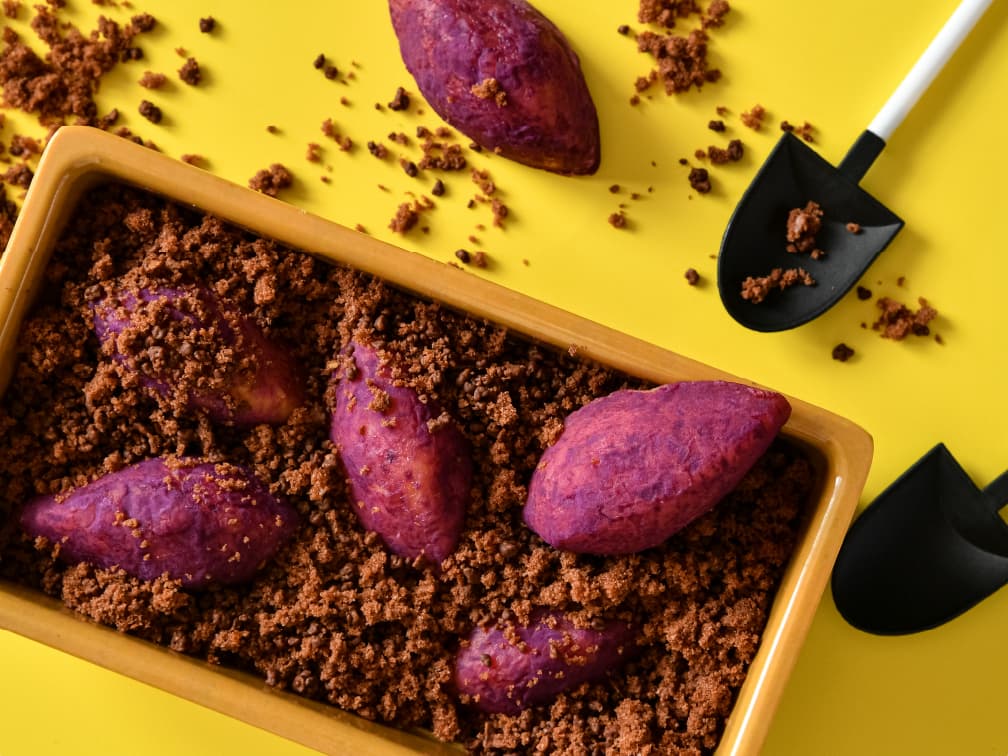 お芋プリンの上部に、土をイメージとしたチョコケーキをちりばめました。掘り進めると中からは、ごろっとしたお芋が出てきます。付属のシャベルでお芋掘り体験を楽しみながらご賞味ください。