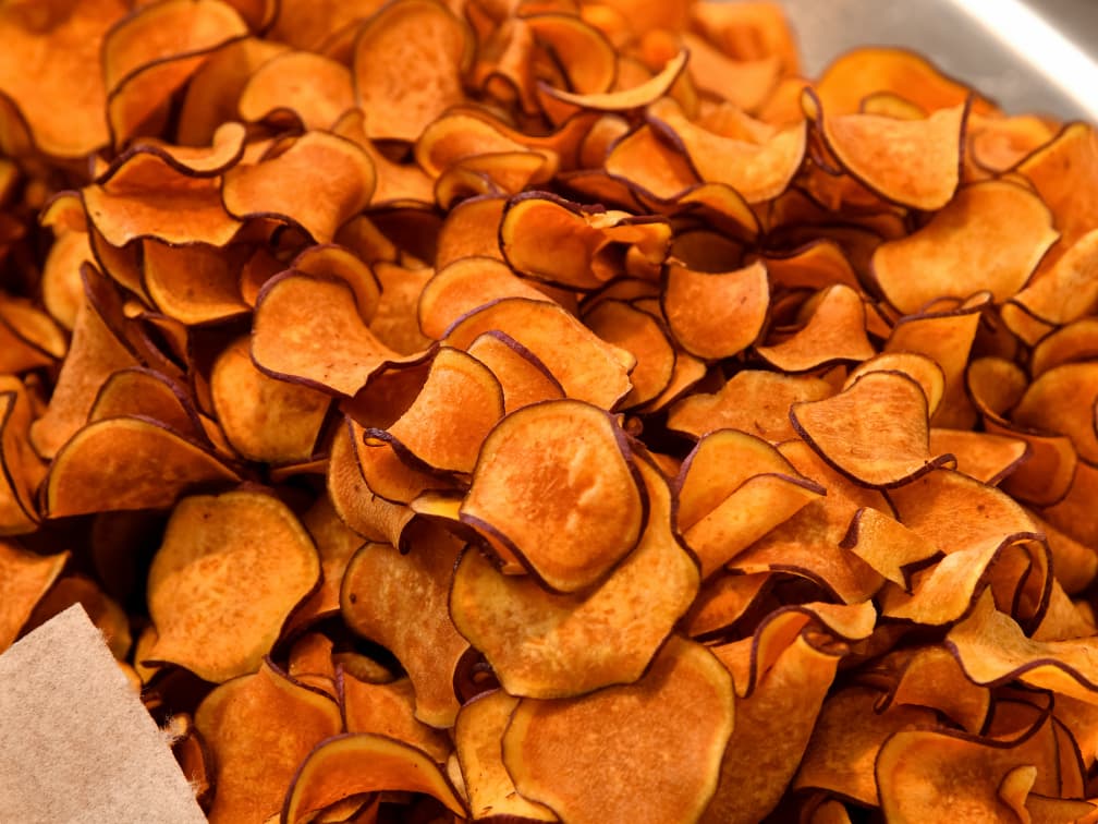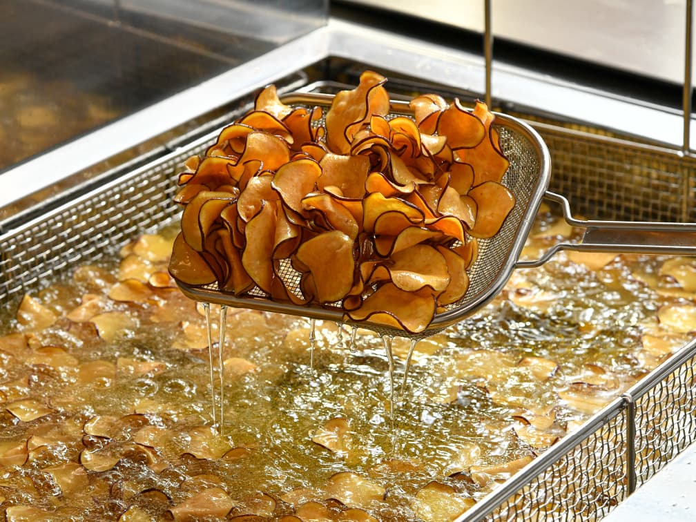 お芋のチップスは揚げたてをあつあつでご提供いたします。