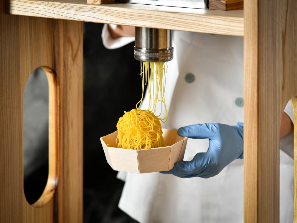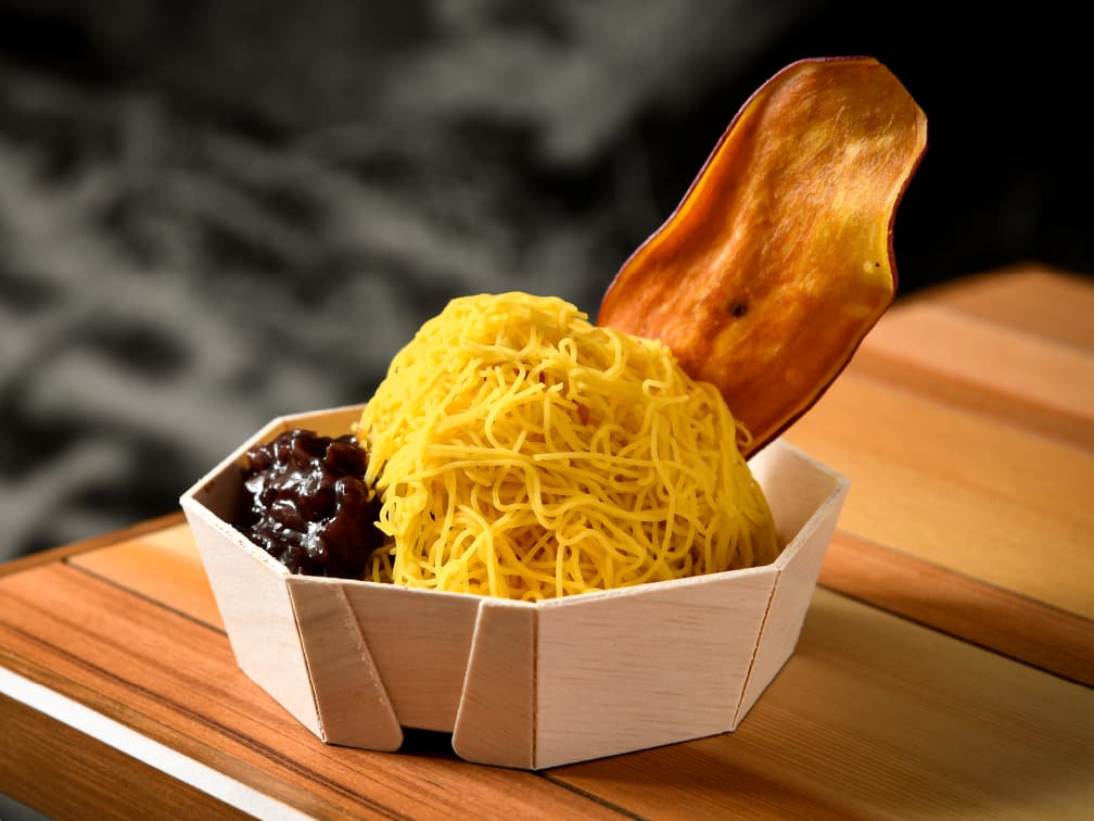 目の前で絞る、できたての贅沢お芋のモンブラン。モンブランの下にはとみつ金時の焼き芋や、アイスなどモンブランの中でもオリジナルのお芋感と食感を楽しめます。できたてをその場でお楽しみください。